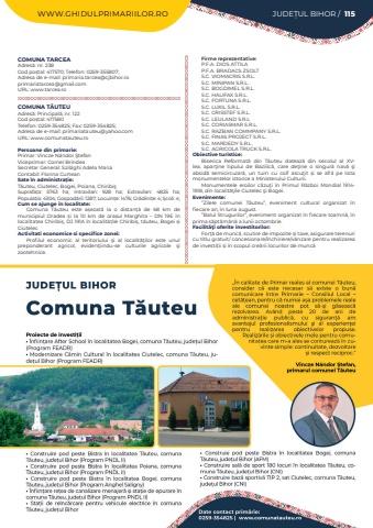 WWW.GHIDULPRIMARIILOR.RO JUDE%u021aUL BIHOR / 115COMUNA TARCEAAdres%u0103: nr. 238Cod po%u0219tal: 417570; Telefon: 0259-355807; Adresa de e-mail: primaria.tarcea@cjbihor.roprimariatarcea@gmail.comURL: www.tarcea.roCOMUNA T%u0102UTEUAdres%u0103: Principal%u0103, nr. 122Cod po%u0219tal: 417580Telefon: 0259-354825; Fax: 0259-354825; Adresa de e-mail: primariatauteu@yahoo.comURL: www.comunatauteu.roPersoane din primarie:Primar: Vincze N%u00e1ndor %u015etefanViceprimar: Cornel BrindeaSecretar General: Szil%u00e1ghi Adela MariaContabil: Florina CurteanSate %u00een administra%u021bie:T%u0103uteu, Ciutelec, Bogei,%u00a0Poiana,%u00a0Chiribi%u015fSuprafa%u021ba:%u00a0 5763 ha; Intravilan:%u00a0 928 ha; Extravilan:%u00a0 4825 ha; Popula%u021bia:%u00a04304; Gospod%u0103rii:%u00a01287; Locuin%u021be:%u00a01476; Gr%u0103dini%u021be:%u00a04; %u0218coli:%u00a04; Cum se ajunge in localitate:Comuna T%u0103uteu este a%u0219ezat%u0103 la o distan%u021b%u0103 de 68 km de municipiul Oradea %u0219i la 10 km de ora%u0219ul Marghita %u2013 DN 19E %u00een localitatea Chiribi%u0219, DJ 191A %u00een localit%u0103%u021bile Chiribi%u0219, t%u0103uteu, Bogei %u0219i CiutelecActivitati economice si specifice zonei:Profilul economic al teritoriului %u015fi al localit%u0103%u0163ilor este unul preponderant agricol, eviden%u0163iindu-se culturile agricole %u015fi zootehnice.Firme reprezentative:P.F.A. DIOS ATTILAP.F.A. BRADACS ZSOLTS.C. VIOMACRIS S.R.L.S.C. MINIPAN S.R.L.S.C. BOGDIMEL S.R.L.S.C. HALIFAX S.R.L.S.C. FORTUNA S.R.L.S.C. LUXIL S.R.L.S.C. CRISSTEF S.R.L.S.C. LEULAND S.R.LS.C. CORIASMAR S.R.L.S.C. RAZBAN COMMPANY S.R.L.S.C. FINAS PROJECT S.R.L.S.C. MARDEDY S.R.L. S.C. AGRICOLA TRUCK S.R.L.Obiective turistice:Biserica Reformat%u0103 din T%u0103uteu dateaz%u0103 din secolul al XVlea, apar%u0163ine tipului de Bazilic%u0103, care de%u0163ine o singur%u0103 nav%u0103 %u015fi absid%u0103 semicircular%u0103, un turn cu coif ascu%u0163it %u0219i se afl%u0103 pe lista monumentelor istorice a Ministerului Culturii. Monumentele eroilor c%u0103zu%u0163i %u00een Primul R%u0103zboi Mondial 1914-1918, din localit%u0103%u0163ile Ciutelec %u015fi Bogei.Evenimente:%u201dZilele comunei T%u0103uteu%u201d, eveniment cultural organizat %u00een fiecare an, %u00een luna august. %u201dBalul Strugurilor%u201d, eveniment organizat %u00een fiecare toamn%u0103, %u00een prima s%u0103pt%u0103m%u00e2n%u0103 a lunii octombrie.Facilit%u00e3%u0163i oferite investitorilor:For%u021b%u0103 de munc%u0103, scutire de impozite %u0219i taxe, asigurare terenuri cu titlu gratuit/ concesionare/%u00eenchiriere/v%u00e2nzare pentru realizarea de investi%u021bii %u0219i %u00een scopul cre%u0103rii locurilor de munc%u0103