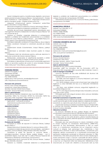 WWW.GHIDULPRIMARIILOR.RO JUDE%u021aUL BRA%u0218OV / 169Solu%u021bii inteligente pentru transformarea digital%u0103 a serviciului public parc%u0103ri la nivelul Ora%u0219ului R%u00e2%u0219nov- Componenta 10 %u2013 Fondul local, Investi%u021bia I.2 %u2013 Sub-investi%u021bia I.1.2 %u2013 Asigurarea infrastructurii pentru transport verde %u2013 ITS/alte infrastructuri TICAsigurare Infrastructur%u0103 pentru transportul verde-Piste pentru biciclete, %u00een Ora%u0219ul R%u00e2%u0219novRenovare energetic%u0103 moderat%u0103 a liceului tehnologic R%u00e2%u0219novRenovarea energetic%u0103 moderat%u0103 a gr%u0103dini%u021bei nr. 3, R%u00e2%u0219novAchizi%u021bia de eco-insule digitalizate pentru dezvoltarea unui management eficient al de%u0219eurilor la nivelul Ora%u0219ului R%u00e2%u0219nov%u201d (13 eco-insule de tip 2)Dotarea cu mobilier, materiale didactice %u0219i echipamente digitale a unit%u0103%u021bilor de %u00eenv%u0103%u021b%u0103m%u00e2nt preuniversitar %u0219i a unit%u0103%u021bilor conexe din ora%u0219ul R%u00e2%u0219nov, jude%u021bul Bra%u0219ov%u00a0, , prin PNRR Pilonul VI. Politici pentru noua genera%u021bie Componenta C15Extindere re%u021bea ap%u0103-canalizare %u00een Ora%u0219ul R%u00e2%u0219nov, Zona Gl%u0103jerieRe%u021bea canalizare menajer%u0103 %u0219i canalizare pluvial%u0103 pe strada CrinuluiModernizare strada Crizantemelor, Ora%u0219ul R%u00e2%u0219nov, jude%u021bul Bra%u0219ovModernizare %u0219i extindere re%u021bea iluminat public %u00een Ora%u0219ul R%u00e2%u0219novAmplasare sta%u021bii de re%u00eenc%u0103rcare pentru vehicule electrice %u00een sta%u021biunea turistic%u0103 de interes na%u021bional R%u00e2%u0219novRestaurarea, conservarea %u0219i valorificarea durabil%u0103 a cet%u0103%u021bii R%u00e2%u0219nov( incinta de Vest) %u0219i crearea infrastructurii conexeExtinderea %u0219i dezvoltarea infrastructurii turistice/de agrement sportiv %u0219i serviciilor publice de turism %u00een zona Complex Olimpic Valea C%u0103rbunarii%u201d Ora%u0219%u00a0R%u00e2%u0219nov, jude%u021bul Bra%u0219ovCOMUNA RECEAAdres%u0103: Principal%u0103, nr. 42Cod po%u0219tal: 507180Telefon: 0268-246003; Fax: 0268-246003; Adresa de e-mail: primaria_receabv@yahoo.comURL: http://www.comunarecea.ro/Persoane din primarie:Primar:%u00a0Ioan Cristian B%u0103rg%u0103oanuViceprimar: Viorel D%u0103nu%u0163%u00a0MilosanSecretar General:%u00a0Mirela Maria Mo%u0163ocContabil: %u00a0Simona Petronela Comaniciu%u00a0Sate %u00een administra%u021bie:Recea, Berivoi, Sasciori, S%u0103v%u0103streni, Ia%u015fi, Gura-V%u0103ii, DejaniSuprafa%u021ba:%u00a0 15944 ha; Intravilan:%u00a0 671,95 ha; Extravilan:%u00a0 15272 ha; Popula%u021bia:%u00a03135; Gospod%u0103rii:%u00a01106; Gr%u0103dini%u021be:%u00a05; %u0218coli:%u00a07; Activitati economice si specifice zonei:Agricultur%u0103 - cultivarea cartofuluiExploatarea %u015fi prelucrarea lemnuluiComer%u0163 %u015fi serviciiObiective turistice:Valea RaduluiValea DejanuluiValea BerivoiuluiM%u00e2n%u0103stirea DejaniM%u00e2n%u0103stirea BerivoiFacilit%u00e3%u0163i oferite investitorilor:Aprobare pentru racord%u0103rile tuturor utilit%u0103%u0163ilor din localitateConcesion%u0103ri - %u00eenchirieri terenuriProiecte de investi%u0163ii:Canalizare %u0219i statie de epurare %u00een Comuna Recea, Jude%u021bul Bra%u0219ov PNDL 2Modernizare drum forestier Berivoi %u00een comuna Recea AFIRCanalizare %u0219i sta%u021bie de epurare %u00e2n comuna Recea %u2013 extindere + racorduri, comuna Recea, jude%u021bul Bra%u0219ov ANGHEL SALIGNYCanalizare %u015fi sta%u0163ie de epurare %u00een comuna Recea %u2013 extindere+racorduri, comuna Recea, jude%u0163ul Bra%u015fov - Lot 2, localit%u0103%u021bile Dejani, Gura V%u0103ii, Ia%u0219i%u201d %u00een cadrul Planului Na%u021bional de Redresare %u0219i Rezilien%u021b%u0103 al Rom%u00e2niei, Componenta 1Modernizare drum comunal DC 69, comuna Recea , Jude%u021bul Bra%u0219ov ANGHEL SALIGNYDotarea cu mobilier, materiale didactice %u0219i echipamente digitale a unit%u0103%u021bilor de %u00eenv%u0103%u021b%u0103m%u00e2nt preuniversitar %u0219i a unit%u0103%u021bilor conexe, finan%u021bat din Componenta C15 PNRRDezvoltarea infrastructurii TIC a comunei Recea, jude%u021b Bra%u0219ov Componenta C10 PNRRMUNICIPIUL S%u0102CELEAdres%u0103: P-%u0163a Libert%u0103%u0163ii, nr. 17Cod po%u0219tal: 505600Telefon: 0268-276198; Fax: 0268-273091; Adresa de e-mail: primaria@municipiulsacele.roURL: www.municipiulsacele.roCOMUNA S%u00c2MB%u0102TA DE SUSAdres%u0103: Lisei, nr. 150Cod po%u0219tal: 507266Telefon: 0268-246901; Fax: 0368-816325; Adresa de e-mail: primariasambata@yahoo.comURL: www.primari-sambata.roPersoane din primarie:Primar:%u00a0Nicolae%u00a0Morariu%u00a0Viceprimar: Ioan%u00a0Paicu%u00a0Secretar General:%u00a0 Adrian Traian Gavril%u0103Contabil:%u00a0 Doina Tatiana%u00a0Bot%u0103Sate %u00een administra%u021bie:S%u00e2mb%u0103ta de Sus, Zona turistic%u0103 S%u00e2mb%u0103taSuprafa%u021ba:%u00a0 4687 ha; Intravilan:%u00a0 310 ha; Extravilan:%u00a0 4377 ha; Popula%u021bia:%u00a01610; Gospod%u0103rii:%u00a0580; Locuin%u021be:%u00a0580; Gr%u0103dini%u021be:%u00a01; %u0218coli:%u00a01; Cum se ajunge in localitate:Comuna S%u00e2mb%u0103ta de Sus este str%u0103b%u0103tut%u0103 de drumuri de interes jude%u021bean.Accesul c%u0103tre comun%u0103 se face prin:-%u00a0DJ 105B, care face leg%u0103tura cu Drumul Na%u021bional 1, prin satul S%u00e2mb%u0103ta de jos, comuna Voila-%u00a0D.J. 105 B str%u0103bate comuna de la Nord spre Sud, asigur%u00e2nd leg%u0103tura cu satul S%u00e2mb%u0103ta de Sus %u0219i cu Sta%u021biunea Climateric%u0103 S%u00e2mb%u0103ta-%u00a0 DJ 104A, care str%u0103bate comuna, asigur%u00e2nd leg%u0103turile cu localit%u0103%u021bile Dr%u0103gu%u0219 %u0219i Lisa.-%u00a0DC 77, care asigur%u0103 accesul dinspre satul Voivodeni, comuna Voila (de la Vest, la Est). Principala gar%u0103 care asigur%u0103 accesul c%u0103tre comuna S%u00e2mb%u0103ta de Sus este Gara F%u0103g%u0103ra%u0219.Activitati economice si specifice zonei:La S%u00e2mb%u0103