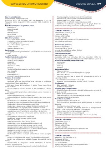 WWW.GHIDULPRIMARIILOR.RO JUDE%u021aUL BR%u0102ILA / 177Sate %u00een administra%u021bie:Movila Miresei, Tepe%u015f Vod%u0103, EsnaSuprafa%u021ba:%u00a0 8000 ha; Intravilan:%u00a0 450 ha; Extravilan:%u00a0 6700 ha; Popula%u021bia:%u00a0 4420; Gospod%u0103rii:%u00a0 1559; Locuin%u021be:%u00a0 1500; Gr%u0103dini%u021be:%u00a0 4; %u0218coli:%u00a04; Activitati economice si specifice zonei:Agricultur%u0103Legumicultur%u0103Comer%u0163Prest%u0103ri serviciiPiscicultur%u0103Cre%u015fterea animalelor%u00a0Obiective turistice:Lacul s%u0103rat Movila Miresii3 biserici ortodoxe %u015fi 1 biseric%u0103 catolic%u01033 amenaj%u0103ri piscicoleSe poate investi %u00een agroturismTurism balnearSta%u0163iune de tratamentEvenimente:T%u00e2rg de produse agroalimentare %u015fi industriale - %u00een fiecare zi de s%u00e2mb%u0103t%u0103Zilele %u015ecolilorFacilit%u00e3%u0163i oferite investitorilor:Teren pentru investi%u0163iiAcces la drum na%u0163ionalGar%u0103 CFRSta%u0163ie PECOTeleviziune cabluInternetTelefonie digital%u0103 %u015fi acoperire telefonie mobil%u0103Ap%u0103 potabil%u0103CanalizareEnergie electric%u0103Facilit%u0103%u0163i conform codului fiscalProiecte de investi%u0163ii:Proiecte propuseRealizare re%u021bea de distrubu%u021bie gaze naturale %u00een localit%u0103%u021bile Movila Miresii, %u021aepe%u0219-Vod%u0103, EsnaExtindere re%u021bea de canalizare %u00een satele %u021aepe%u0219-Vod%u0103, Esna, strada NuferilorIntroducerea %u00een circuitul turistic %u0219i de agrement a Lacului S%u0103ratPictur%u0103, gard %u00eemprejmuitor, sistematizare curtea interioar%u0103 la Biserica EsnaConstruire clopotni%u021b%u0103 %u00een sat %u021aepe%u0219-Vod%u0103Construire centru multifunc%u021bional la biserica din satul Movila MiresiiModernizare teren de fotbal satul Movila MiresiiPiste de biciclete pe traseul Movila Miresii-%u021aepe%u0219-Vod%u0103-EsnaModernizare drumuri de exploatare agricoleModernizare dispensarul medical din satul Movila Miresii%u00cenfiin%u021bare centru de %u00eengrijire pentru persoane v%u00e2rsticeAcordarea de stimulente financiare familiilor cu nou n%u0103scu%u021biAcordare de premii familiilor la peste 50 ani de c%u0103snicieAtribuirea de terenuri intravilane pentru construirea de locuin%u021be%u00cenfiin%u021bare parc industrial %u00een fostul CAPReabilitare %u0218coala primar%u0103 Movila MiresiiProiecte realizateRe%u021bea de canalizare satul Movila MiresiiModernizare re%u021bea de ap%u0103 potabil%u0103 Movila MiresiiConstruire centru de agrement sat Movila MiresiiConstruire teren sport satele Movila Miresii %u0219i EsnaModernizare drum comunal DC 47 Movila Miresii- EsnaModernizare punct sanitar sat %u021aepe%u0219-Vod%u0103Sistem supraveghere video sat EsnaModernizare c%u0103mine culturale satele Movila Miresii %u0219i %u021aepe%u0219Vod%u0103Dotare cu mobilier %u0219colar %u0218coala Gimnazial%u0103 Movila MiresiiDotare cu echipamente digitale %u0218coala Gimnazial%u0103 Movila MiresiiIntroducerea %u00een programul %u201dMas%u0103 s%u0103n%u0103toas%u0103%u201d a tuturor %u0219colarilor %u0219i pre%u0219colarilorLucr%u0103ri de igienizare dispensarul medical Movila MiresiiFinalizarea picturilor biserice%u0219ti din Movila MresiiModernizrae %u0219i ecologizare cimitire Movila MiresiiModernizare str%u0103zi Movila MiresiiDotare SVSU cu tehnic%u0103 modern%u0103(autospecial%u0103) Platforme individuale depozitare gunoi de grajd, dotare cu buldoescavator, vidanj%u0103, inc%u0103rc%u0103tor frontal, remorci autoCOMUNA RACOVI%u0162AAdres%u0103: Calea Custura, nr. 53Cod po%u0219tal: 817105Telefon: 0239-698725; Fax: 0239-698791; Adresa de e-mail: primaria.racovita@yahoo.comURL: www.racovita-br.roPersoane din primarie:Primar: Tudorel%u00a0G%u00e2sc%u0103%u00a0Viceprimar: F%u0103nel TurcuSecretar General: Elena Iuliana%u00a0Dinicu%u00a0Contabil: Ionica%u00a0Cirea%u015feSate %u00een administra%u021bie:Racovi%u0163a, Custura, CorbeniSuprafa%u021ba:%u00a0 4533 ha; Intravilan:%u00a0 255 ha; Extravilan:%u00a0 4774 ha; Popula%u021bia:%u00a01134; Gospod%u0103rii:%u00a0477; Locuin%u021be:%u00a0588; Gr%u0103dini%u021be:%u00a01; %u0218coli:%u00a03; Activitati economice si specifice zonei:Agricultur%u0103ZootehnieComer%u0163Fier%u0103rieObiective turistice:P%u0103durea BoarcaR%u00e2ul Buz%u0103u - cu posibilitate de pescuit %u015fi plaj%u0103P%u0103durea CrestataCimitirul Racovi%u0163a pe o movil%u0103 cu altitudinea de 18 m %u015fi suprafa%u0163a de 2 haBiserica %u201cSfin%u0163ii Trei Ierarhi%u201d - Racovi%u0163aBiserica %u201cSfin%u0163ii Arhangheli Mihail %u015fi Gavril%u201d - CusturaEvenimente:Ziua localit%u0103%u0163ii - 14 iuniePia%u0163%u0103 %u00een ziua de mar%u0163iFacilit%u00e3%u0163i oferite investitorilor:Disponibilitatea din partea autorit%u0103%u0163ii locale pentru terenuri %u015fi for%u0163%u0103 de munc%u0103Re%u0163ea de ap%u0103 %u015fi electricitateTelefonie digital%u0103 %u015fi acoperire telefonie mobil%u0103Cabinete medicale %u015fi farmacieProiecte de investi%u0163ii:Reabilitare spa%u021biu socio cultural%u00cenfiin%u021bare centru de colectare cu aport voluntar %u00een comuna Racovi%u021baSta%u021bii de %u00eenc%u0103rcare vehicule autoDotarea cu mobilier, materiale didactice %u0219i echipamente digitale a %u0219colii gimnaziale Racovi%u021ba, jude%u021bul Br%u0103ilaModernizare drumuri de exploatare agricole%u00cenfiin%u021bare platform%u0103 comunal%u0103 tip pc2 Cre%u0219terea capacit%u0103%u021bii de interven%u021bie a serviciului voluntarCOMUNA ROMANUAdres%u0103: Sfatului, nr. 10Cod po%u0219tal: 817115Telefon: 0239-697142; Fax: 0239-697142; Adresa de e-mail: primariaromanu@ymail.comURL: www.primariaromanu.roCOMUNA RO%u015eIORIAdres%u0103: str. Trandafirului ,nr 32Cod po%u0219tal: 817120Telefon: 0239-699492; Fax: 0239-699493; Adresa de e-mail: primaria_rosiori@yahoo.comURL: https://rosiori-br.ro/