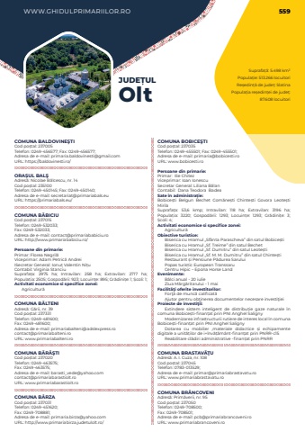 WWW.GHIDULPRIMARIILOR.RO 559Suprafa%u021b%u0103: 5.498 km%u00b2Popula%u021bie: 513.266 locuitoriRe%u0219edin%u021b%u0103 de jude%u021b: SlatinaPopula%u021bia re%u0219edin%u021bei de jude%u021b: 87.608 locuitoriJUDE%u021aULOltCOMUNA BALDOVINE%u015eTICod po%u0219tal: 237005Telefon: 0249-456577; Fax: 0249-456577; Adresa de e-mail: primaria.baldovinesti@gmail.comURL: https://baldovinesti.ro/ORA%u0218UL BAL%u015eAdres%u0103: Nicolae B%u0103lcescu, nr. 14Cod po%u0219tal: 235100Telefon: 0249-450145; Fax: 0249-450140; Adresa de e-mail: secretariat@primariabals.euURL: https://primariabals.eu/COMUNA B%u0102BICIUCod po%u0219tal: 237015Telefon: 0249-532033; Fax: 0249-532033; Adresa de e-mail: contact@primariababiciu.roURL: http://www.primariababiciu.ro/Persoane din primarie:Primar: Florea Negril%u0103Viceprimar:%u00a0Adam Petric%u0103 AndreiISecretar General:%u00a0Ionu%u021b Valentin Ni%u021buContabil: Virginia StanciuSuprafa%u021ba:%u00a0 2975 ha; Intravilan:%u00a0 258 ha; Extravilan:%u00a0 2717 ha; Popula%u021bia:%u00a02505; Gospod%u0103rii:%u00a0923; Locuin%u021be:%u00a0895; Gr%u0103dini%u021be:%u00a01; %u0218coli:%u00a01; Activitati economice si specifice zonei:Agricultur%u0103 COMUNA B%u0102LTENIAdres%u0103: G%u0103rii, nr. 39Cod po%u0219tal: 237331Telefon: 0249-481600; Fax: 0249-481600; Adresa de e-mail: primariabalteni@adslexpress.rocontact@primariabalteni.roURL: www.primariabalteni.roCOMUNA B%u0102R%u0102%u015eTICod po%u0219tal: 237020Telefon: 0249-463575; Fax: 0249-463575; Adresa de e-mail: barasti_vede@yahoo.comcontact@primariabarastiolt.roURL: www.primariabarastiolt.roCOMUNA B%u00c2RZACod po%u0219tal: 237031Telefon: 0249-451620; Fax: 0249-708881; Adresa de e-mail: primaria.birza@yahoo.comURL: http://www.primariabirza.judetulolt.ro/COMUNA BOBICE%u015eTICod po%u0219tal: 237035Telefon: 0249-455501; Fax: 0249-455501; Adresa de e-mail: primaria@bobicesti.roURL: www.bobicesti.roPersoane din primarie:Primar:%u00a0 Ilie%u00a0ChitezViceprimar: Ioan%u00a0Ionescu%u00a0Secretar General: Liliana%u00a0B%u0103lan%u00a0Contabil:%u00a0 Dana Teodora%u00a0%u00a0BadeaSate %u00een administra%u021bie:Bobice%u0219ti Belgun Bechet Com%u0103ne%u0219ti Chinte%u0219ti Govora Leote%u0219ti MirilaSuprafa%u021ba:%u00a0 53,6 kmp; Intravilan:%u00a0 118 ha; Extravilan:%u00a0 3196 ha; Popula%u021bia:%u00a0 3220; Gospod%u0103rii:%u00a0 1293; Locuin%u021be:%u00a0 1293; Gr%u0103dini%u021be:%u00a0 3; %u0218coli:%u00a04; Activitati economice si specifice zonei:Agricultur%u0103Obiective turistice:Biserica cu Hramul %u201eSf%u00e2nta Parascheva%u201d din satul Bobice%u0219tiBiserica cu Hramul %u201eSf. Treime%u201d din satul BechetBiserica cu Hramul %u201eSf. Dumitru%u201d din satul Leote%u0219tiBiserica cu Hramul %u201eSf. M. M. Dumitru%u201d din satul Chinte%u0219tiRestaurant %u0219i Pensiune P%u0103durea SaruluiPopas turistic European TranssaruCentru Hipic %u2013 Epona Horse LandEvenimente:B%u00e2lci anual - 20 iulieZiua M%u0103rg%u0103ritarului - 1 maiFacilit%u00e3%u0163i oferite investitorilor:For%u0163%u0103 de munc%u0103 calificat%u0103Ajutor pentru ob%u0163inerea documentelor necesare investi%u0163ieiProiecte de investi%u0163ii:Extindere sistem inteligent de distribu%u021bie gaze naturale %u00een comuna Bobice%u0219ti-finan%u021bat prin PNI Anghel SalignyModernizarea infrastructurii rutiere de interes local %u00een comuna Bobice%u0219ti-finan%u021bat prin PNI%u00a0Anghel SalignyDotarea cu mobilier ,materiale didactice %u0219i echipamente digitale a unit%u0103%u021bilor de i+%u00eenv%u0103%u021b%u0103m%u00e2nt-finan%u021bat prin PNRR-c15Reabilitare cl%u0103diri administrative -finan%u021bat prin PNRRCOMUNA BRASTAV%u0102%u0162UAdres%u0103: A. I. Cuza, nr. 108Cod po%u0219tal: 237045Telefon: 0783-013529; Adresa de e-mail: primar@primariabrastavatu.roURL: www.primariabrastavatu.roCOMUNA BR%u00c2NCOVENIAdres%u0103: Prim%u0103verii, nr. 95Cod po%u0219tal: 237050Telefon: 0249-708500; Fax: 0249-708501; Adresa de e-mail: pcb@primariabrancoveni.roURL: www.primariabrancoveni.ro