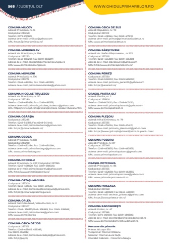 568 / JUDE%u021aUL OLT WWW.GHIDULPRIMARIILOR.ROCOMUNA MILCOVAdres%u0103: Principal%u0103, nr. 15Cod po%u0219tal: 237260Telefon: 0372-919969; Adresa de e-mail: cmilcov@yahoo.comURL: https://primariamilcov.ro/COMUNA MORUNGLAVAdres%u0103: str. Principala ,nr 294Cod po%u0219tal: 237270Telefon: 0349-883201; Fax: 0349-883207; Adresa de e-mail: contact@primariamorunglav.roURL: www.primariamorunglav.roCOMUNA MOVILENIAdres%u0103: Principal%u0103, nr. 176Cod po%u0219tal: 237275Telefon: 0249-482024; Fax: 0249-482225; Adresa de e-mail: primariamovileni64@yahoo.comCOMUNA NICOLAE TITULESCUAdres%u0103: str. Principala, nr 120Cod po%u0219tal: 237280Telefon: 0249-485436; Fax: 0249-485335; Adresa de e-mail: primaria_nicolae_titulescu@yahoo.comURL: https://www.cjolt.ro/ro/primarii/primaria-nicolae-titulescu.htmlCOMUNA OB%u00c2R%u015eIACod po%u0219tal: 237285Telefon: 0249-541318; Fax: 0249-541440; Adresa de e-mail: primariaobarsia@yahoo.comURL: https://primariaobirsia.ro/COMUNA OBOGAAdres%u0103: Principal%u0103, nr.238Cod po%u0219tal: 237290Telefon: 0249-450284; Fax: 0249-450284; Adresa de e-mail: primariaoboga@yahoo.comURL: www.primariaoboga.roCOMUNA OPORELUAdres%u0103: Principal%u0103, nr. 237; Cod po%u0219tal: 237295Telefon: 0249-468020; Fax: 0249-468020; Adresa de e-mail: primariaoporelu@yahoo.comURL: http://www.primariaoporelu.ro/COMUNA OPTA%u015eI-M%u0102GURACod po%u0219tal: 237300Telefon: 0249-481535; Fax: 0249-481545; Adresa de e-mail: primariaoptasimagura@yahoo.comURL: https://primariaoptasimagura.roCOMUNA ORLEAAdres%u0103: Sat Orlea Nou%u0103, Valea Dun%u0103rii, nr. 2Cod po%u0219tal: 237307Telefon: 0249- 536331,0249- 536569; Fax: 0249- 536569; Adresa de e-mail: primariaorlea@yahoo.comURL: www.primariaorleaCOMUNA OSICA DE JOSCod po%u0219tal: 237153Telefon: 0249-455015, 455085; Fax: 0249-455085; Adresa de e-mail: primariaosicadejos@yahoo.comURL: http://poj.ro/COMUNA OSICA DE SUSAdres%u0103: Republicii, nr. 70Cod po%u0219tal: 237310Telefon: 0249-418064; Fax: 0249-417910; Adresa de e-mail: primar@primariaosicadesus.roURL: www.primariaosicadesus.roCOMUNA P%u00c2R%u0218COVENIAdres%u0103: str. Stefan P%u00e2r%u0219coveanu , nr.223Cod po%u0219tal: 237325Telefon: 0249-455308; Fax: 0249-455308; Adresa de e-mail: clpirscoveni@yahoo.comURL: http://www.primariapirscoveni.ro/COMUNA PERIE%u0162ICod po%u0219tal: 237330Telefon: 0349-525000; Fax: 0349-525000; Adresa de e-mail: primaria_perieti91@yahoo.comURL: https://perietiolt.ro/ORA%u0218UL PIATRA OLTAdres%u0103: Florilor, nr. 2Cod po%u0219tal: 235500Telefon: 0349-803010; Fax: 0349-803010; Adresa de e-mail: primariapiatraolt@yahoo.comURL: www.primariapiatraolt.roCOMUNA PLE%u015eOIUAdres%u0103: Mihai Eminescu, nr. 79Cod po%u0219tal: 237335Telefon: 0249-474024; Fax: 0249-474121; Adresa de e-mail: primaria_plesoiuolt@yahoo.comURL: https://www.cjolt.ro/ro/primarii/primaria-pleoiu.htmlCOMUNA POBORUAdres%u0103: Prim%u0103riei, nr. 87Cod po%u0219tal: 237345Telefon: 0249-463835; Fax: 0249-463835; Adresa de e-mail: primariapoboru@gmail.comURL: www.primariapoboru.roORA%u0218UL POTCOAVAAdres%u0103: Principal%u0103, nr. 86Cod po%u0219tal: 237355Telefon: 0249-462038; Fax: 0249-462355; Adresa de e-mail: primariapotcoava@yahoo.comURL: www.primarie.potcoava-olt.roCOMUNA PRISEACACod po%u0219tal: 237360Telefon: 0249-480020; Fax: 0249-480001; Adresa de e-mail: secretar_priseaca@yahoo.comURL: https://www.priseaca-olt.ro/COMUNA RADOMIRE%u015eTIAdres%u0103: Eroilor, nr. 47Cod po%u0219tal: 237365Telefon: 0374-001618; Fax: 0249-489306; Adresa de e-mail: secretar@primariaradomiresti.roURL: www.primariaradomiresti.judetulolt.roPersoane din primarie:Primar: Nicu%u015for S%u00eeiaViceprimar: Marinel OlteanuSecretar: Florina Laura Nu%u0163%u0103Contabil: Gabriela - Florentina Neaga