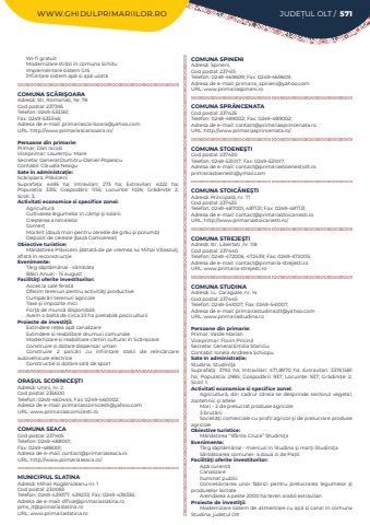 WWW.GHIDULPRIMARIILOR.RO JUDE%u021aUL OLT / 571Wi-fi gratuitModernizare str%u0103zi %u00een comuna SchituImplementare sistem GIS%u00cenfiin%u021bare sistem ap%u0103 %u0219i ap%u0103%u00a0uzat%u0103COMUNA SC%u0102RI%u015eOARAAdres%u0103: Str, Romana%u021bi, Nr. 78Cod po%u0219tal: 237395Telefon: 0249-533361; Fax: 0249-533346; Adresa de e-mail: primariascarisoara@yahoo.comURL: http://www.primariascarisoara.ro/Persoane din primarie:Primar: Dan Iacob%u00a0Viceprimar:%u00a0Lauren%u0163iu%u00a0 MareSecretar General:Dumitru-Daniel Popescu%u00a0Contabil:%u00a0Claudia Neagu%u00a0Sate %u00een administra%u021bie:Sc%u0103ri%u015foara, Pl%u0103viceniSuprafa%u021ba:%u00a0 4495 ha; Intravilan:%u00a0 273 ha; Extravilan:%u00a0 4222 ha; Popula%u021bia:%u00a0 3315; Gospod%u0103rii:%u00a0 1155; Locuin%u021be:%u00a0 1026; Gr%u0103dini%u021be:%u00a0 2; %u0218coli:%u00a03; Activitati economice si specifice zonei:Agricultur%u0103Cultivarea legumelor %u00een c%u00e2mp %u015fi solariiCre%u015fterea animalelor Comer%u0163Mor%u0103rit (dou%u0103 mori pentru cereale de gr%u00e2u %u015fi porumb)Depozit de cereale (baz%u0103 Comcereal)Obiective turistice:M%u0103n%u0103stirea Pl%u0103viceni (datat%u0103 de pe vremea lui Mihai Viteazul), aflat%u0103 %u00een reconstruc%u0163ieEvenimente:T%u00e2rg s%u0103pt%u0103m%u00e2nal - s%u00e2mb%u0103taB%u00e2lci Anual - 15 augustFacilit%u00e3%u0163i oferite investitorilor:Acces la cale ferat%u0103Oferim terenuri pentru activit%u0103%u0163i productiveCump%u0103r%u0103ri terenuri agricoleTaxe %u015fi impozite miciFor%u0163%u0103 de munc%u0103 disponibil%u0103Avem o balt%u0103 de circa 23 ha pretabil%u0103 pisciculturiiProiecte de investi%u0163ii:Extindere re%u021bea ap%u0103 canalizareExtindere %u0219i reabilitare drumuri comunaleModernizare %u0219i reabilitare c%u0103min cultural %u00een Sc%u0103ri%u0219oareConstruire %u0219i dotare dispensar umanConstruire 2 parc%u0103ri cu %u00eenfiin%u021bare sta%u021bii de re%u00eenc%u0103rcare autovehicule electriceConstruc%u021bie %u0219i dotare sal%u0103%u00a0de sportORA%u0218UL SCORNICE%u015eTIAdres%u0103: Unirii, nr. 2Cod po%u0219tal: 235600Telefon: 0249-460444; Fax: 0249-460002; Adresa de e-mail: primariascornicesti@yahoo.comURL: www.primariascornicesti.roCOMUNA SEACACod po%u0219tal: 237405Telefon: 0249-488001; Fax: 0249-488001; Adresa de e-mail: contact@primariaseaca.roURL: http://www.primariaseaca.ro/MUNICIPIUL SLATINAAdres%u0103: Mihail Kog%u0103lniceanu nr. 1Cod po%u0219tal: 230083Telefon: 0249-439377, 439233; Fax: 0249-439336; Adresa de e-mail: office@primariaslatina.ropms_it@primariaslatina.roURL: www.primariaslatina.roCOMUNA SPINENIAdres%u0103: Spineni,Cod po%u0219tal: 237415Telefon: 0249-469609; Fax: 0249-469609; Adresa de e-mail: primaria_spineni@yahoo.comURL: www.primariaspineni.roCOMUNA SPR%u00c2NCENATACod po%u0219tal: 237425Telefon: 0249-489002; Fax: 0249-489002; Adresa de e-mail: contact@primariasprincenata.roURL: http://www.primariasprincenata.ro/COMUNA STOENE%u015eTICod po%u0219tal: 237430Telefon: 0249-531017; Fax: 0249-531017; Adresa de e-mail: contact@primariastoenestiolt.roprimariastoenesti@ymail.comCOMUNA STOIC%u0102NE%u015eTIAdres%u0103: Principal%u0103, nr. 71Cod po%u0219tal: 237435Telefon: 0249-487001, 487131; Fax: 0249-487131; Adresa de e-mail: contact@primariastoicanesti.roURL: http://www.primariastoicanesti.ro/COMUNA STREJE%u015eTIAdres%u0103: str. Libertati ,nr. 118Cod po%u0219tal: 237440Telefon: 0249-472006, 472439; Fax: 0249-472005; Adresa de e-mail: contact@primaria-strejesti.roURL: www.primaria-strejesti.roCOMUNA STUDINAAdres%u0103: I.L. Caragiale, nr. 14Cod po%u0219tal: 237445Telefon: 0249-541007; Fax: 0249-541007; Adresa de e-mail: primariastudinaott@yahoo.comURL: www.primariastudina.roPersoane din primarie:Primar: Vasile Marian%u00a0Viceprimar:%u00a0Florin Pricin%u0103%u00a0Secretar General:Emilia Stanciu%u00a0Contabil: Ionela Andreea %u0218chiopu%u00a0Sate %u00een administra%u021bie:Studina, Studini%u0163aSuprafa%u021ba:%u00a0 3792 ha; Intravilan:%u00a0 471,8970 ha; Extravilan:%u00a0 3319,1581 ha; Popula%u021bia:%u00a02985; Gospod%u0103rii:%u00a0937; Locuin%u021be:%u00a0937; Gr%u0103dini%u021be:%u00a02; %u0218coli:%u00a01; Activitati economice si specifice zonei:Agricultur%u0103, din cadrul c%u0103reia se desprinde sectorul vegetal, zootehnic %u015fi alteleMori - 2 de prelucrat produse agricole3 brut%u0103riiSociet%u0103%u0163i comerciale cu profil agricol %u015fi de prelucrare produse agricole%u00a0Obiective turistice:M%u0103n%u0103stirea %u201cSf%u00e2nta Cruce%u201d Studini%u0163aEvenimente:T%u00e2rg s%u0103pt%u0103m%u00e2nal - miercuri %u00een Studina %u015fi mar%u0163i Studini%u0163aS%u0103rb%u0103toarea comunei- a doua zi de Pa%u0219tiFacilit%u00e3%u0163i oferite investitorilor:Ap%u0103 curent%u0103CanalizareIluminat publicConcesionarea unor fabrici pentru prelucrarea legumelor %u015fi produselor lactateArendarea a peste 2000 ha teren arabil extravilanProiecte de investi%u0163ii:Modernizare sistem de alimentare cu ap%u0103%u00a0%u0219i canal %u00een comuna Studina, jude%u021bul Olt