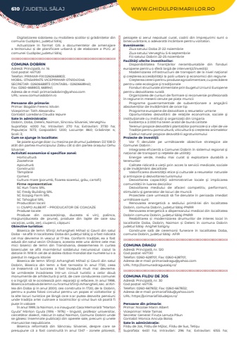 610 / JUDE%u021aUL S%u0102LAJ WWW.GHIDULPRIMARIILOR.RODigitalizarea sidotarea cu mobiliera %u0219colilor %u0219i gr%u0103dini%u021belor din comuna Cuz%u0103plac, jude%u021bul S%u0103lajActualizare %u00een format GIS a documentelor de amenajare a teritoriului %u0219i de planificare urban%u0103%u00a0 %u0219i de elaborare a PUG ,al comunei Cuz%u0103plac,judetul S%u0103lajCOMUNA DOBRINAdres%u0103: Principal%u0103, nr. 16Cod po%u0219tal: 457120Telefon: PRIMAR-FIX:0260668803; MOBIL: 0745499475 VICEPRIMAR-0741041046 SECRETAR- 0260668873 CONTABIL- 0260668940; Fax: 0260-668803, 668941; Adresa de e-mail: primariadobrin@yahoo.comURL: www.comunadobrin.roPersoane din primarie:Primar: Bogd%u00e1n Ferenc Istv%u00e1nViceprimar: Toth AlexandruContabil: Loredana Claudia IepureSate %u00een administra%u021bie:Dobrin, Doba, Deleni, Naimon, S%u00eencraiu Silvaniei, VerveghiuSuprafa%u021ba:%u00a0 4000 ha; Intravilan:%u00a0 270 ha; Extravilan:%u00a0 3730 ha; Popula%u021bia:%u00a0 1573; Gospod%u0103rii:%u00a0 1200; Locuin%u021be:%u00a0 860; Gr%u0103dini%u021be:%u00a0 4; %u0218coli:%u00a03; Cum se ajunge in localitate:Se poate ajunge doar cu ma%u0219ina pe drumul jude%u021bean DJ 108 D at%u00e2t din partea municipiului Zalau c%u00e2t %u0219i din partea ora%u0219ului Cehu SilvanieiActivitati economice si specifice zonei:Horticultur%u0103ZootehnieApicultur%u0103Construc%u021biiT%u00e2mpl%u0103rieComer%u021bCultura mare%u00a0(porumb, floarea soarelui, gr%u00e2u, cartofi)Firme reprezentative: SC Kun Trans SRLSC Fredy Building SRLSC Ecopig Farm SRLSC Tahogbal SRLProduc%u0103tori locali:I.I. CSAPO ALBERT %u2013 PRODUCATOR DE COACAZEProduse locale:Produse din coacaze(sirop, duceata si vin), palinca, magiun(duceata de prune), produse din lapte de oaie sau vaca(cas, urda, zer), ciuperci, c%u0103p%u0219uniObiective turistice:Biserica de lemn Sfin%u0163ii Arhangheli Mihail %u0219i Gavril din satul Doba - se afl%u0103 %u00een localitatea Doba din jude%u0163ul S%u0103laj %u015fi a fost ridicat%u0103 cel mai devreme %u00een veacul al 17-lea. Conform tradi%u0163iei, ea a fost adus%u0103 din satul vecin Chilioara, aceasta este una dintre cele mai mici biserici de lemn din Transilvania, deasemenea %u00een curtea bisericu%u021bei se afl%u0103%u00a0 morm%u00e2ntul soldatului necunoscut cazut la datorie %u00een 1918 %u00een cel de al doilea r%u0103zboi mondial dar numele lui s-a pierdut %u00een negura istorieiBiserica de lemn Sfin%u0163ii Arhangheli Mihail %u0219i Gavril din satul Dobrin, Biserica din lemn a fost tarnosita %u00een anul 1720, ceea ce %u00eenseamn%u0103 c%u0103 lucrarea a fost %u00eenceput%u0103 mult mai devreme. Se urm%u0103re%u0219te %u00eencadrarea %u00eentr-un circuit turistic a celor dou%u0103 monumente de arhitectur%u0103 %u015fi art%u0103, de care conducerea comunei s-a %u00eengrijit s%u0103 le ocroteasc%u0103 prin repara%u0163ii %u015fi refacere, %u00een anul 1998, Biserica ortodox%u0103 de lemn cu hramul Sfin%u0163ii Arhangheli, sec. al XVIlea din Doba %u015fi %u00een anul 2000, cea construita %u00een 1720, de la Dobrin, pentru a putea folosi circuitul pentru un popas al vizitatorilor %u015fi la alte locuri turistice pe l%u00e2ng%u0103 care s-ar putea dezvolta pensiuni unde tradi%u0163ia artei culinare a localnicilor %u015fi vinul bun s%u0103 poat%u0103 fi puse %u00een valoare%u00cen anul 1999, la Naimon, s-a inaugurat Casa Memorial%u0103 %u201cMarton Gyula%u201d M%u00e1rton Gyula (1916 - 1976) %u2013 lingvist, profesor universitar, cercet%u0103tor dialect, n%u0103scut %u00een satul Naimon, Comuna Dobrin unde se g%u0103sesc %u00eensemnate publica%u0163ii din operele sale, precum %u015fi unele manuscrise nepublicate. Biserica reformat%u0103 din S%u00e2ncraiu Silvaniei, despre care se presupune c%u0103 a fost construit%u0103 %u00een anul 1347 - zonele pitore%u0219ti, peisajele %u0219i aerul nepoluat curat, codrii din %u00eemprejurimi sunt o binecuv%u00e2ntare, o adevarat%u0103 %u00eenc%u00e2ntare pentru vizitatori.Evenimente:Ziua satului Doba 21-22 noiembrieZiua satului Verveghiu 5-6 septembrie Fiii satului Dobrin 22-25 noiembrieFacilit%u00e3%u0163i oferite investitorilor:Disponibilitatea finan%u0163%u0103rilor nerambursabile din fonduri europene pentru o sfer%u0103 larg%u0103 de interven%u0163ii/investi%u0163iiModernizarea infrastructurii de transport de la nivel na%u0163ional %u015fi cre%u015fterea accesibilit%u0103%u0163ii la polii urbani %u015fi economici din regiuneCre%u015fterea cererii pentru produse agroalimentare, cu prec%u0103dere pentru cele ecologice %u015fi tradi%u0163ionaleFonduri structurale alimentate prin bugetul Uniunii Europene pentru dezvoltarea rural%u0103Organizarea de cursuri de formare %u0219i reconversie profesional%u0103 %u00een regiune %u00een meserii cerute pe pia%u021ba munciiPrograme guvernamentale de subven%u021bionare a angaj%u0103rii absolven%u021bilor de %u00eenv%u0103%u021b%u0103m%u00e2nt de orice tipPrograme europene de dezvoltare a resurselor umaneOportunitatea dezvolt%u0103rii de rela%u0163iile economice, sociale %u015fi institu%u0163ionale cu institu%u0163ii %u015fi organiza%u0163ii din UngariaExisten%u021ba a 2.000 ha teren arabil de bun%u0103 calitateTerenuri propice dezvolt%u0103rii planta%u021biilor pomicole %u0219i a vi%u021bei de vieTradi%u021bie pentru pomicultur%u0103, viticultur%u0103 %u0219i cre%u0219terea animalelorCadrul natural propice dezvolt%u0103rii agroturismuluiProiecte de investi%u0163ii:Vor fi derulate pe urm%u0103toarele obiective strategice ale Comunei Dobrin :Integrarea eficient%u0103 a Comunei Dobrin %u00een sistemul regional %u015fi na%u021bional de transport %u0219i re%u0163elele de utilit%u0103%u0163iEnergie verde, mediu mai curat %u0219i exploatare durabil%u0103 a terenurilorCalitate ridicat%u0103 a vie%u0163ii prin acces la servicii medicale, sociale %u015fi de %u00eenv%u0103%u0163%u0103m%u00e2nt decalitateValorificarea diversit%u0103%u0163ii etice %u015fi culturale a resurselor naturale %u015fi antropice %u015fi dezvoltarea turismuluiDezvoltar