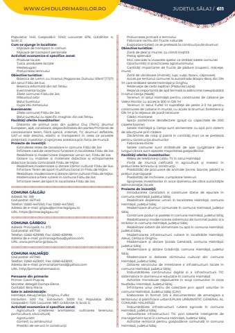 WWW.GHIDULPRIMARIILOR.RO JUDE%u021aUL S%u0102LAJ / 611Popula%u021bia:%u00a0 1441; Gospod%u0103rii:%u00a0 1040; Locuin%u021be:%u00a0 676; Gr%u0103dini%u021be:%u00a0 4; %u0218coli:%u00a02; Cum se ajunge in localitate:Mijloace de transport %u00een comun Mijloace de transport personaleActivitati economice si specifice zonei:Produse locale:%u021auica, produsele lactateMe%u0219te%u0219ugari: Prelucrarea lemnuluiObiective turistice:Biserica de Lemn cu hramul,,Pogorarea Duhului Sfant%u201d(1727)din satul Fildu de SusBiserica reformat%u0103%u00a0din sat.Teti%u0219uEvenimente localeZilele comunei Fildu de JosM%u0103suri%u0219ul oilorBalul SuretuluiCupa V%u0103ii Alma%u0219uluiEvenimente:Zilele comunei Fildu de JosBalul suretului cu specific maghiar din sat.Teti%u0219uFacilit%u00e3%u0163i oferite investitorilor:Distan%u021ba%u00a0 de primul ora%u0219%u00a0 din jude%u021bul%u00a0 Cluj (7km), drumul European, ap%u0103, canalizare, disponibilitatea din partea Prim%u0103riei de concesionare teren, fibr%u0103%u00a0 optic%u0103, internet, TV, drumuri asflatate, UAT-ul este deschis, elastic %u0219i transparent %u00een ceea ce prive%u0219te poten%u021bialii%u00a0investitori %u0219i sprijinrea acestora prin for%u021ba de munc%u0103Proiecte de investi%u0163ii:Extinderea re%u021bea de canalizare %u00een comuna Fildu de Jos%u00cenfiin%u021bare cas%u0103%u00a0de ceremonii funerare %u00een localitatea%u00a0Fildu de JosReabilitare %u0219i modernizare Dispensar uman sat. Fildu de JosDotare cu mobilier %u0219i materiale didactice %u0219i echipamente didactice %u0218coala Gimnazial%u0103 Fildu de MijlocReabilitare,modernizare %u0219i dotare C%u0103min cultural Fildu de Sus%u00cenfiin%u021bare Teren de sport multifunc%u021bional %u00een Fildu de MijlocReabilitare, modernizare %u0219i dotare c%u0103min cultural Fildu de MijlocModernizare artere rutiere %u00een comuna Fildu de Jos%u00cenfiin%u021bare teren de sport %u00een localitatea Fildu de JosCOMUNA G%u00c2LG%u0102UAdres%u0103: Nr. 169Cod po%u0219tal: 457140Telefon: 0260-647250; Fax: 0260-647250; Adresa de e-mail: gilgau@primariagilgau.roURL: https://primariagilgau.ro/COMUNA G%u00c2RBOUAdres%u0103: Principal%u0103, nr. 272Cod po%u0219tal: 457150Telefon: 0260-639199; Fax: 0260-639199; Adresa de e-mail: primariagirbou@yahoo.comURL: www.primaria-girbou.roCOMUNA HALM%u0102%u015eDCod po%u0219tal: 457160Telefon: 0260-623001; Fax: 0260-623001; Adresa de e-mail: primariahalmasd@yahoo.comURL: http://primariahalmasd.roPersoane din primarie:Primar: Gavril Pu%u015fca%u015fSecretar delegat:Dom%u015fa Elena%u00a0Contabil: Biri%u015f MariaSate %u00een administra%u021bie:Halm%u0103%u015fd, Aleu%u015f,Ceri%u015fa, Drighiu, FufezIntravilan:%u00a0 500 ha; Extravilan:%u00a0 3000 ha; Popula%u021bia:%u00a0 2500; Gospod%u0103rii:%u00a01120; Locuin%u021be:%u00a0987; Gr%u0103dini%u021be:%u00a05; %u0218coli:%u00a05; Activitati economice si specifice zonei:Agricultur%u0103 (cre%u015fterea animalelor, cultivarea terenului, pomicultur%u0103, silvicultur%u0103)AgroturismComer%u0163 cu am%u0103nuntulPrest%u0103ri de servicii %u00een construc%u0163iiPrelucrarea primar%u0103 a lemnuluiFabricare rachiu din fructe naturaleExploatare balast ce se preteaz%u0103 la construc%u0163ia de drumuriObiective turistice:Zon%u0103 de deal %u015fi munte, cu clim%u0103 lini%u015ftit%u0103Peisaj splendidMici cascade la izvoarele apelor ce str%u0103bat satele comuneiOportunit%u0103%u0163i %u00een practicarea agroturismuluiCantit%u0103%u0163i importante de fructe de p%u0103dure (ciuperci, m%u0103ce%u015fe, mure)Zon%u0103 de v%u00e2n%u0103toare (mistre%u0163i, lupi, vulpi, fazani, c%u0103prioare)Acces pe teritoriul comunei la autostrada Bra%u015fov-Bor%u015f din DN 1H care str%u0103bate satele Halm%u0103%u015fd %u015fi DrighiuRezerva%u0163ie de cerbi lop%u0103tari (P%u0103durea Lapi%u015f)Rezerv%u0103 important%u0103 de ap%u0103 termal%u0103 la ad%u00e2ncime neexploatat%u0103 %u00een satul Ceri%u015fa (Nad%u0103)Terenuri %u00een satul Halm%u0103%u015fd pentru construirea de cabane pe Valea Morilor cu acces la 500 %u00een DN 1HTerenuri %u00een satul Fufez %u00een suprafe%u0163e de peste 2-3 ha pentru construirea de cabane %u00een munte, cu acces la drumuri forestiere %u015fi DN 1H %u015fi la re%u0163eaua de joas%u0103 tensiuneCl%u0103diri montaneSpa%u0163ii zootehnice dezafectate (grajd cu capacitate de 200 capete bovine)Satele Halm%u0103%u015fd %u015fi Ceri%u015fa sunt alimentate cu ap%u0103 prin sistem de aduc%u0163iune prin c%u0103dereZ%u0103c%u0103minte de nisip %u015fi piatr%u0103 %u00een cantit%u0103%u0163i mari ce se preteaz%u0103 pentru construc%u0163ia drumurilorFabricarea sticleiSatele comunei sunt str%u0103b%u0103tute de ape curg%u0103toare de-a lungul c%u0103rora sunt a%u015fezate majoritatea gospod%u0103riilorFacilit%u00e3%u0163i oferite investitorilor:Re%u0163ea de telefonie %u015fi cablu TV %u00een satul Halm%u0103%u015fdFor%u0163%u0103 de munc%u0103 calificat%u0103 %u00een agricultur%u0103 %u015fi meserii %u00een prelucrarea lemnului %u015fi construc%u0163iiPosibilit%u0103%u0163i de procurare de animale (ovine, bovine, p%u0103s%u0103ri) la pre%u0163uri avantajoasePosibilit%u0103%u0163i de %u00eenchiriere, cump%u0103rare terenuriSprijinirea investitorilor %u00een orice domeniu de c%u0103tre autorit%u0103%u0163ile administra%u0163iei localeProiecte de investi%u0163ii:Introducerea canaliz%u0103rii %u0219i construire sta%u021bie de epurare %u00een comuna Halm%u0103%u015fd, jude%u021bul S%u0103lajReabilitare dispensar uman %u00een localitatea Halm%u0103%u015fd, comuna Halm%u0103%u015fd, jude%u0163ul S%u0103lajModernizare drumuri comunale %u00een comuna Halma%u0219d, jude%u021bul S%u0103lajConstruire poduri %u0219i pode%u021be %u00een comuna Halm%u0103%u0219d, jude%u021bul S%u0103lajReabilitarea %u015fi modernizarea sistemului de iluminat public %u0219i a str%u0103zilor %u00een comuna Halm%u0103%u015fd, jude%u0163ul S%u0103lajReabilitare sistem de alimentare cu ap%u0103 %u00een comuna Halm%u0103%u0219d, jude%