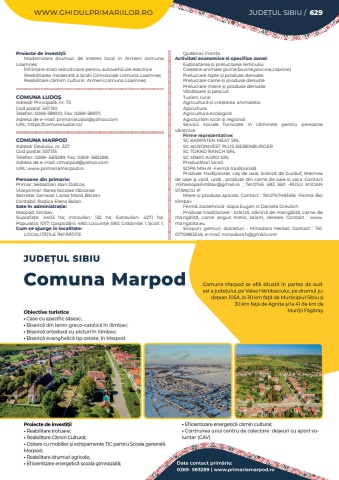 WWW.GHIDULPRIMARIILOR.RO JUDE%u021aUL SIBIU / 629Proiecte de investi%u0163ii:Modernizare drumuri de interes local in Armeni comuna Loamne%u0219%u00cenfiin%u021bare sta%u021bii re%u00eenc%u0103rcare pentru autovehicule electriceReabilitarea moderat%u0103 a %u0218colii Gimnaziale comuna Loamne%u0219Reabilitare c%u0103mim cultural%u00a0 Armeni,comuna Loamne%u0219 COMUNA LUDO%u015eAdres%u0103: Principal%u0103, nr. 73Cod po%u0219tal: 557130Telefon: 0269-589101; Fax: 0269-589111; Adresa de e-mail: primarialudos@yahoo.comURL: https://comunaludos.ro/COMUNA MARPODAdres%u0103: Dealului, nr. 327Cod po%u0219tal: 557135Telefon: 0269- 583289; Fax: 0269- 583288; Adresa de e-mail: clmarpod@yahoo.comURL: www.primariamarpod.roPersoane din primarie:Primar: Sebastian Ioan Dotco%u0219Viceprimar: Rare%u0219 Nicolae ObroceaSecretar General: Larisa Maria B%u00e2rsanContabil: Rodica Elena BolanSate %u00een administra%u021bie:Marpod, IlimbavSuprafa%u021ba:%u00a0 4403 ha; Intravilan:%u00a0 132 ha; Extravilan:%u00a0 4271 ha; Popula%u021bia:%u00a01017; Gospod%u0103rii:%u00a0480; Locuin%u021be:%u00a0580; Gr%u0103dini%u021be:%u00a01; %u0218coli:%u00a01; Cum se ajunge in localitate:LOCALIT%u0102%u021aILE %u00ceNFR%u0102%u021aITEQu%u00e9briac Fran%u021baActivitati economice si specifice zonei:Exploatarea %u0219i prelucrarea lemnuluiCre%u0219tere animale (ovine,bovine,porcine,caprine)Prelucrare lapte %u0219i produse derivatePrelucrare carne %u0219i produse derivatePrelucrare miere %u0219i produse derivateV%u00e2n%u0103toare %u0219i pescuitTurism ruralAgricultur%u0103 %u0219i cre%u0219terea animalelorApiculturaAgricultura ecologic%u0103Agroturism local %u0219i regionalServicii sociale furnizate %u00een c%u0103minele pentru persoane v%u00e2rstniceFirme reprezentative:SC KARPATEN MEAT SRLSC AGROINVEST PLUS SIEBENBURGERSC TOKKO RANCH SRLSC MI&IO AGRO SRL Produc%u0103tori locali:SOPA MIHAI -Ferm%u0103%u00a0tradi%u021bional%u0103Produse tradi%u0163ionale: ca%u015f de oaie, br%u00e2nz%u0103 de burduf, telemea de oaie %u015fi vac%u0103, urd%u0103 , produse din carne de oaie si vaca .Contact :mihaisopailimbav@gmail.ro ; Tel.0745 483 550 -RUSU M.IOAN STANCIU IFMiere %u0219i produse apicole. Contact : Tel.0747493416 -Ferma Bio IlimbavFerm%u0103 zootehnic%u0103- Sopa Eugen si Daniela GreulichProduse tradi%u021bionale : br%u00e2nz%u0103, sl%u0103nin%u0103 de mang%u0103li%u021b%u0103, carne de mang%u0103li%u021b%u0103, carne angus metis, salam, cereale. Contact : www.mangalita.euSiropuri, gemuri, dulce%u021buri - Minodora Herbei: Contact : Tel. 0770983246, e-mail: minodora.h@gmail.com