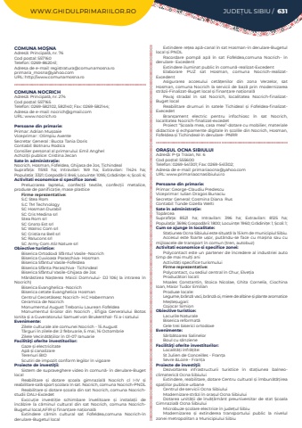 WWW.GHIDULPRIMARIILOR.RO JUDE%u021aUL SIBIU / 631COMUNA MO%u015eNAAdres%u0103: Principal%u0103, nr. 76Cod po%u0219tal: 557160Telefon: 0269-862041; Adresa de e-mail: registratura@comunamosna.roprimaria_mosna@yahoo.comURL: http://www.comunamosna.roCOMUNA NOCRICHAdres%u0103: Principal%u0103, nr. 274Cod po%u0219tal: 557165Telefon: 0269-582102, 582140; Fax: 0269-582144; Adresa de e-mail: nocrich@gmail.comURL: www.nocrich.roPersoane din primarie:Primar: Adrian Mu%u0219oaieViceprimar : Olimpiu AxenteSecretar General : Bucsa Tania DorisContabil: Botnaru RodicaConsilier personal al primarului: Emil AnghelAchizi%u021bii publice: Cristina JecanSate %u00een administra%u021bie:Nocrich, Hosman, Fofeldea, Ghijasa de Jos, %u021aichindealSuprafa%u021ba:%u00a0 11593 ha; Intravilan:%u00a0 169 ha; Extravilan:%u00a0 11424 ha; Popula%u021bia:%u00a03321; Gospod%u0103rii:%u00a0846; Locuin%u021be:%u00a01095; Gr%u0103dini%u021be:%u00a04; %u0218coli:%u00a06; Activitati economice si specifice zonei:Prelucrarea laptelui, confec%u021bii textile, confec%u021bii metalice, produse de panifica%u021bie, mase plasticeFirme reprezentative:S.C Stea RomS.C TM TechnologySC Hosman DurabilSC Cris Medina srlStea Rom srlSC Gnato Est srlSC Walnic Com srlSC Cristiana Bell srlSC Ralucons srlSC Army Com ASI Nature srl%u00a0Obiective turistice:Biserica Ortodox%u0103%u00a0Sf%u00e2ntul Vasile -NocrichBiserica Cuvioasa Paraschiva- HosmanBiserica Sf%u00e2ntul Vasile-FofeldeaBiserica Sf%u00e2nta Paraschiva- TichindealBiserica Sf%u00e2ntul Vasile-Ghijasa de JosM%u0103n%u0103stirea Na%u0219terea Maicii Domnului- DJ 106( la intrarea %u00een Nocrich)Biserica Evanghelica -NocrichBiserica cetate Evanghelica HosmanCentrul Cercet%u0103sesc Nocrich- H.C HabermannCeramica de Nocrich Monumentul August Treboniu Laurean FofeldeaMonumentul Eroilor din Nocrich , Efigia Generalului Botos Ionita %u0219i a Guveratorului Samuel von Brukenthal- fii a-i satuluiEvenimente:Zilele culturale ale comunei Nocrich - 15 August%u00a0T%u00e2rguri %u00een zilele de: 2 februarie, 5 mai, 16 OctombrieZilele Vecin%u0103t%u0103%u021biilor %u00een 01-07 IanuarieFacilit%u00e3%u0163i oferite investitorilor:Gaze %u0219i electricitateAp%u0103 %u0219i canalizareTerenuri BIOScutiri de impozit conform legilor %u00een vigoareProiecte de investi%u0163ii:Sistem de supraveghere video %u00een comun%u0103- %u00een derulare-Buget localReabilitare %u0219i dotare %u0219coala gimnazial%u0103%u00a0 Nocrich cl I-IV %u0219i reabilitare sal%u0103%u00a0sport %u0219colara %u00een sat. Nocrich, comuna Nocrich-PNDLReabilitare %u0219i dotare %u0219coala din sat Nocrich, comuna Nocrichstudii DALI-ExcedetExccu%u021bie investi%u021bie schimbare %u00eenvelitoare %u0219i%u00a0 instala%u021bii de %u00eenc%u0103lzire la c%u0103minul cultural din sat Nocrich, comuna NocrichBugetul local,AFIR %u0219i finan%u021bare na%u021bional%u0103Extindere c%u0103min cultural sat Fofeldea,comuna Nocrich-%u00een derulare-Bugetul localExtindere re%u021bea ap%u0103-canal %u00een sat Hosman-%u00een derulare-Bugetul local %u0219i PNDLRacordare pomp%u0103%u00a0 ap%u0103%u00a0 %u00een sat Fofeldea,comuna Nocrich- %u00een derulare- ExcedentExtindere iluminat public %u00een comun%u0103-realizat-ExcedentElaborare PUZ sat Hosman, comuna Nocrich-realizatExcedentAsigurarea accesului cet%u0103%u021benilor din zona Verzelor, sat Hosman, comuna Nocrich la servicii de baz%u0103%u00a0prin modernizarea str%u0103zii-Finalizat-Buget local %u0219i finan%u021bare na%u021bional%u0103Pavaj stradal %u00een sat Nocrich, localitatea Nocrich-finalizatBuget localReabilitare drumuri %u00een satele Tichideal %u0219i Fofeldea-finalizatExecedetBran%u0219ament electric pentru infochiosc %u00een sat Nocrich, localitatea Nocrich-finalizat-excedetProiect %u201c%u0218coala mea, casa mea%u201d-dotare cu mobilier, materiale didactice %u0219i echpamente digitale %u00een %u0219colile din Nocrich, Hosman, Fofeldea %u0219i Tichindeal-%u00een derulare- PNRRORA%u0218UL OCNA SIBIULUIAdres%u0103: P-%u0163a Traian, Nr. 6Cod po%u0219tal: 555600Telefon: 0269-541301; Fax: 0269-541302; Adresa de e-mail: primariaocna@yahoo.comURL: www.primariaocnasibiului.roPersoane din primarie:Primar: George-Claudiu Predescu%u00a0Viceprimar: Iulian Dragos BunaciuSecretar General:%u00a0Cosmina Diana%u00a0 Rus%u00a0Contabil: T%u00fande Gizella Welti%u00a0Sate %u00een administra%u021bie:Top%u00e2rceaSuprafa%u021ba:%u00a0 8521 ha; Intravilan:%u00a0 396 ha; Extravilan:%u00a0 8125 ha; Popula%u021bia:%u00a03696; Gospod%u0103rii:%u00a01800; Locuin%u021be:%u00a01960; Gr%u0103dini%u021be:%u00a01; %u0218coli:%u00a01; Cum se ajunge in localitate:Sta%u021biunea Ocna Sibiului este situat%u0103%u00a0la 15 km de municipiul Sibiu.Accesul este foarte u%u0219or, put%u00e2ndu-se face cu ma%u0219ina sau cu mijloacele de transport %u00een comun (tren, autobuz)Activitati economice si specifice zonei:Polycontact este un partener de %u00eencredere al industriei auto timp de mai mul%u021bi aniActivit%u0103%u021bi specifice turismuluiFirme reprezentative:Polycontact, cu sediul central %u00een Chur, Elve%u021biaProduc%u0103tori locali:Moales Constantin, Stoica Nicolae, Ghita Cornelia, Ciochina Ioan, Maior Tudor EmilianProduse locale:Legume, br%u00e2nz%u0103%u00a0vaci, br%u00e2nz%u0103%u00a0oi, miere de albine %u0219i plante aromatice Me%u0219te%u0219ugari: Cojocar SimionObiective turistice:Lacurile NaturaleBiserica reformat%u0103Cele trei biserici ortodoxeEvenimente:S%u0103rb%u0103toarea SalinelorBoul cu s%u00e2nzieneFacilit%u00e3%u0163i oferite investitorilor:Localit%u0103%u021bi %u00eenfr%u0103%u021bite:St Julien de Conceilles - Fran%u021baSevre &Loire - Fran%u021baProiecte de investi%u0163ii:Dezvoltarea infrastructurii turistice %u00een sta%u021biunea balneoclimateric%u0103%u00a0Ocna SibiuluiExtindere, reabilitare, dotare Centru cultural %u0219i %u00eembun%u0103t%u0103%u021birea spa%u021biilor publice urbaneCentrul de servicii Ocna SibiuluiModernizare str%u0103zi %u00een ora%u0219ul Ocna SibiuluiDotarea unit%u0103%u02