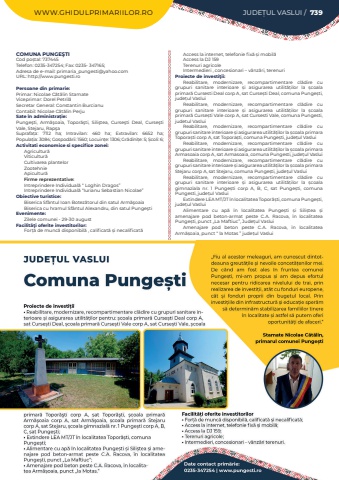 WWW.GHIDULPRIMARIILOR.RO JUDE%u021aUL VASLUI / 739COMUNA PUNGE%u015eTICod po%u0219tal: 737445Telefon: 0235-347254; Fax: 0235- 347165; Adresa de e-mail: primaria_pungesti@yahoo.comURL: http://www.pungesti.roPersoane din primarie:Primar: Nicolae C%u0103t%u0103lin StamateViceprimar: Dorel Petril%u0103Secretar General: Constantin BurcianuContabil: Nicolae C%u0103t%u0103lin PerjuSate %u00een administra%u021bie:Punge%u015fti, Arm%u0103%u015foaia, Topor%u0103%u015fti, Sili%u015ftea, Curse%u015fti Deal, Curse%u015fti Vale, Stejaru, Rap%u015faSuprafa%u021ba:%u00a0 7112 ha; Intravilan:%u00a0 460 ha; Extravilan:%u00a0 6652 ha; Popula%u021bia:%u00a03084; Gospod%u0103rii:%u00a01560; Locuin%u021be:%u00a01306; Gr%u0103dini%u021be:%u00a05; %u0218coli:%u00a06; Activitati economice si specifice zonei:Agricultur%u0103Viticultur%u0103Cultivarea plantelorZootehnieApicultur%u0103Firme reprezentative:Intreprindere Individual%u0103%u00a0%u201c Loghin Dragos%u201dIntreprindere Individual%u0103%u00a0%u201cIurianu Sebastian Nicolae%u201dObiective turistice:Biserica Sf%u00e2ntul Ioan Botez%u0103torul din satul Arm%u0103%u015foaiaBiserica cu hramul Sf%u00e2ntul Alexandru, din satul Punge%u015ftiEvenimente:Zilele comunei - 29-30 augustFacilit%u00e3%u0163i oferite investitorilor:For%u021b%u0103%u00a0de munc%u0103%u00a0disponibil%u0103%u00a0, calificat%u0103%u00a0%u0219i necalificat%u0103Access la internet, telefonie fix%u0103%u00a0%u0219i mobil%u0103Access la DJ 159Terenuri agricoleIntermedieri , concesionari %u2013 v%u00e2nz%u0103ri, terenuriProiecte de investi%u0163ii:Reabilitare, modernizare, recompartimentare cl%u0103dire cu grupuri sanitare interioare %u0219i asigurarea utilit%u0103%u021bilor la %u0219coala primar%u0103%u00a0Cursesti Deal corp A, sat Curse%u0219ti Deal, comuna Punge%u0219ti, jude%u021bul VasluiReabilitare, modernizare, recompartimentare cl%u0103dire cu grupuri sanitare interioare %u0219i asigurarea utilit%u0103%u021bilor la %u0219coala primar%u0103%u00a0Curse%u0219ti Vale corp A, sat Cursesti Vale, comuna Pungesti, judetul VasluiReabilitare, modernizare, recompartimentare cl%u0103dire cu grupuri sanitare interioare %u0219i asigurarea utilit%u0103%u021bilor la %u0219coala primara Topora%u0219ti corp A, sat Topora%u0219ti, comuna Punge%u0219ti, jude%u021bul VasluiReabilitare, modernizare, recompartimentare cl%u0103dire cu grupuri sanitare interioare %u0219i asigurarea utilit%u0103%u021bilor la %u0219coala primara Armasoaia corp A, sat Armasoaia, comuna Pungesti, jude%u021bul VasluiReabilitare, modernizare, recompartimentare cl%u0103dire cu grupuri sanitare interioare %u0219i asigurarea utilit%u0103%u021bilor la %u0219coala primara Stejaru corp A, sat Stejaru, comuna Punge%u0219ti, jude%u021bul VasluiReabilitare, modernizare, recompartimentare cl%u0103dire cu grupuri sanitare interioare %u0219i asigurarea utilit%u0103%u021bilor la %u0219coala gimnaziala nr. 1 Punge%u0219ti corp A, B,%u00a0 C, sat Punge%u0219ti, comuna Pungesti, jude%u021bul VasluiExtindere LEA MT/JT %u00een localitatea Topor%u0103%u0219ti, comuna Punge%u0219ti, jude%u021bul VasluiAlimentare cu ap%u0103%u00a0 %u00een localitatea Punge%u0219ti %u0219i Sili%u0219tea %u0219i amenajare pod beton-armat peste C.A. Racova, %u00een localitatea Punge%u0219ti, punct %u201eLa Maftiuc%u201d, Jude%u021bul VasluiAmenajare pod beton peste C.A. Racova, %u020bn localitatea Arm%u0103%u1e63oaia, punct %u201c la Motas %u201d jude%u1e6dul Vaslui