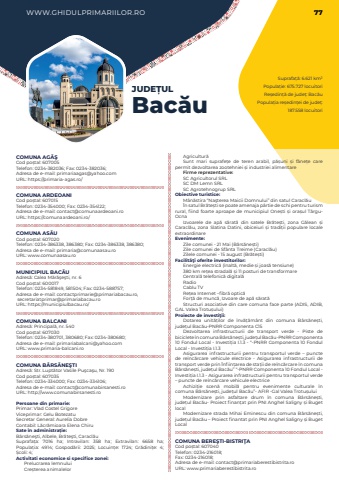 WWW.GHIDULPRIMARIILOR.RO 77Suprafa%u021b%u0103: 6.621 km%u00b2Popula%u021bie: 675.727 locuitoriRe%u0219edin%u021b%u0103 de jude%u021b: Bac%u0103uPopula%u021bia re%u0219edin%u021bei de jude%u021b: 187.558 locuitoriJUDE%u021aULBac%u0103uCOMUNA AG%u0102%u015eCod po%u0219tal: 607005Telefon: 0234-382036; Fax: 0234-382036; Adresa de e-mail: primariaagas@yahoo.comURL: https://primaria-agas.ro/COMUNA ARDEOANICod po%u0219tal: 607015Telefon: 0234-354000; Fax: 0234-354122; Adresa de e-mail: contact@comunaardeoani.roURL: https://comunaardeoani.ro/COMUNA AS%u0102UCod po%u0219tal: 607020Telefon: 0234-386338, 386380; Fax: 0234-386338, 386380; Adresa de e-mail: primaria@comunaasau.roURL: www.comunaasau.roMUNICIPIUL BAC%u0102UAdres%u0103: Calea M%u0103r%u0103%u015fe%u015fti, nr. 6Cod po%u0219tal: 600017Telefon: 0234-581849, 581504; Fax: 0234-588757; Adresa de e-mail: contactprimarie@primariabacau.ro, secretariatprimar@primariabacau.roURL: https://municipiulbacau.ro/COMUNA BALCANIAdres%u0103: Principal%u0103, nr. 540Cod po%u0219tal: 607030Telefon: 0234-380701, 380680; Fax: 0234-380680; Adresa de e-mail: primariabalcani@yahoo.comURL: www.primaria-balcani.roCOMUNA B%u00c2RS%u0102NE%u015eTIAdres%u0103: Str. Lupt%u0103tor Vasile Pu%u015fca%u015fu, Nr. 190Cod po%u0219tal: 607035Telefon: 0234-334000; Fax: 0234-334106; Adresa de e-mail: contact@comunabirsanesti.roURL: http://www.comunabirsanesti.roPersoane din primarie:Primar: Vlad Costel GrigoreViceprimar: Gelu BotezatuSecretar General: Aurelia DobreContabil: L%u0103cr%u0103mioara Elena ChiruSate %u00een administra%u021bie:B%u00e2rs%u0103ne%u015fti, Albele, Br%u0103te%u015fti, Caracl%u0103uSuprafa%u021ba:%u00a0 7016 ha; Intravilan:%u00a0 358 ha; Extravilan:%u00a0 6658 ha; Popula%u021bia:%u00a0 4914; Gospod%u0103rii:%u00a0 2025; Locuin%u021be:%u00a0 1724; Gr%u0103dini%u021be:%u00a0 4; %u0218coli:%u00a04; Activitati economice si specifice zonei:Prelucrarea lemnuluiCre%u0219terea animalelorAgricultur%u0103Sunt mari suprafe%u021be de teren arabil, p%u0103%u0219uni %u0219i f%u00e2ne%u021be care permit dezvoltarea zootehniei %u0219i industriei alimentareFirme reprezentative:SC Agricultorul SRLSC DM Lemn SRLSC Agrotehnogrup SRL%u00a0Obiective turistice:M%u00e2n%u0103stira %u201cNa%u015fterea Maicii Domnului%u201d din satul Caracl%u0103u%u00cen satul Br%u0103te%u0219ti se poate amenaja p%u00e2rtie de schi pentru turism rural, fiind foarte aproape de municipiul One%u0219ti %u0219i ora%u0219ul T%u00e2rguOcna Izvoarele de ap%u0103 s%u0103rat%u0103 din satele Br%u0103te%u0219ti, zona G%u0103lean %u0219i Caracl%u0103u, zona Slatina Datini, obiceiuri %u0219i tradi%u021bii populare locale extraordinareEvenimente:Zile comunei - 21 Mai (B%u00e2rs%u0103ne%u0219ti)Zile comunei de Sf%u00e2nta Treime (Caracl%u0103u)Zilele comunei - 15 august (Br%u0103te%u0219ti)Facilit%u00e3%u0163i oferite investitorilor:Energie electric%u0103 (%u00eenalt%u0103, medie %u0219i joas%u0103 tensiune)380 km re%u021bea stradal%u0103 %u0219i 11 posturi de transformareCentral%u0103 telefonic%u0103 digital%u0103Radio%u00a0Cablu TVRe%u021bea Internet %u2013fibr%u0103 optic%u0103For%u021b%u0103 de munc%u0103, Izvoare de ap%u0103 s%u0103rat%u0103 Structuri asociative din care comuna face parte (ADIS, ADIB, GAL Valea Trotu%u0219ului)Proiecte de investi%u0163ii:Dotarea unit%u0103%u021bilor de %u00eenv%u0103%u021b%u0103m%u00e2nt din comuna B%u00e2rs%u0103ne%u0219ti, jude%u021bul Bac%u0103u-PNRR Componenta C15Dezvoltarea infrastructurii de transport verde - Piste de biciclete %u00een comuna B%u00e2rs%u0103ne%u0219ti, jude%u021bul Bac%u0103u-PNRR Componenta 10 Fondul Local - Investi%u021bia I.1.3 - %u201c-PNRR Componenta 10 Fondul Local - Investi%u021bia I.1.3Asigurarea infrastructurii pentru transportul verde %u2013 puncte de re%u00eenc%u0103rcare vehicule electrice - Asigurarea infrastructurii de transport verde prin %u00cenfiin%u021barea de sta%u021bii de re%u00eenc%u0103rcare %u00een comuna B%u00e2rs%u0103ne%u0219ti, jude%u021bul Bac%u0103u%u201d %u201c-PNRR Componenta 10 Fondul Local - Investi%u021bia I.1.3 - Asigurarea infrastructurii pentru transportul verde %u2013 puncte de re%u00eenc%u0103rcare vehicule electriceAchizi%u021bie scen%u0103 mobil%u0103 pentru evenimente culturale %u00een comuna B%u00e2rs%u0103ne%u0219ti, jude%u021bul Bac%u0103u%u201d- AFIR -Gal Valea Trotu%u0219uluiModernizare prin asfaltare drum %u00een comuna B%u00e2rs%u0103ne%u0219ti, jude%u021bul Bac%u0103u- Proiect finan%u021bat prin PNI Anghel Saligny %u0219i Buget localModernizare strada Mihai Eminescu din comuna B%u00e2rs%u0103ne%u0219ti, jude%u021bul Bac%u0103u %u2013 Proiect finantat prin PNI Anghel Saligny %u0219i Buget LocalCOMUNA BERE%u015eTI-BISTRI%u0162ACod po%u0219tal: 607040Telefon: 0234-216018; Fax: 0234-216018; Adresa de e-mail: contact@primariaberestibistrita.roURL: www.primariaberestibistrita.ro