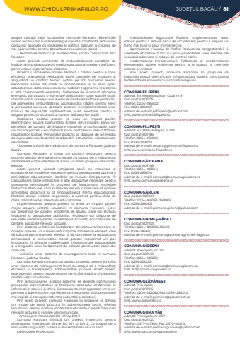 WWW.GHIDULPRIMARIILOR.RO JUDE%u021aUL BAC%u0102U / 81asupra calit%u0103%u021bii vie%u021bii locuitorilor comunei Faraoani. Beneficiile includ accesul la o surs%u0103 de energie sigur%u0103 %u0219i constant%u0103, reducerea costurilor asociate cu %u00eenc%u0103lzirea %u0219i g%u0103titul, precum %u0219i crearea de noi oportunit%u0103%u021bi pentru dezvoltarea economic%u0103 local%u0103.- Reabilitare termic%u0103 %u0219i modernizare %u0218coala Gimnazial%u0103 Nr.1 FaraoanAcest proiect urm%u0103re%u0219te s%u0103 %u00eembun%u0103t%u0103%u021beasc%u0103 condi%u021biile de %u00eenv%u0103%u021b%u0103m%u00e2nt %u0219i s%u0103 asigure un mediu educa%u021bional modern %u0219i eficient pentru elevii %u0219i personalul didactic.Proiectul urm%u0103re%u0219te izolarea termic%u0103 a cl%u0103dirii pentru a spori eficien%u021ba energetic%u0103, reduc%u00e2nd astfel costurile de %u00eenc%u0103lzire %u0219i asigur%u00e2nd un confort termic optim pe tot parcursul anului. Renovarea s%u0103lilor de clas%u0103, a laboratoarelor %u0219i a altor spa%u021bii educa%u021bionale, dotarea acestora cu mobilier ergonomic reprezint%u0103 o alt%u0103 component%u0103 esen%u021bial%u0103. Sistemele de iluminat eficiente energetic vor asigura o iluminare adecvat%u0103 %u00een toate spa%u021biile %u0219colii, contribuind la crearea unui mediu de %u00eenv%u0103%u021bare s%u0103n%u0103tos %u0219i productiv. De asemenea, %u00eembun%u0103t%u0103%u021birea accesibilit%u0103%u021bii cl%u0103dirii pentru elevii %u0219i personalul cu nevoi speciale, precum %u0219i implementarea unor m%u0103suri de siguran%u021b%u0103 suplimentare, sunt esen%u021biale pentru a asigura protec%u021bia %u0219i confortul tuturor utilizatorilor %u0219colii.Realizarea acestui proiect va avea un impact pozitiv semnificativ asupra comunit%u0103%u021bii %u0219colare din Faraoani. Elevii vor beneficia de condi%u021bii de %u00eenv%u0103%u021bare moderne %u0219i confortabile, care vor facilita procesul educa%u021bional %u0219i vor contribui la %u00eembun%u0103t%u0103%u021birea rezultatelor %u0219colare. Personalul didactic va dispune de un mediu de lucru adecvat, favorabil desf%u0103%u0219ur%u0103rii activit%u0103%u021bilor educa%u021bionale de calitate.- Dotarea unit%u0103%u021bii de %u00eenv%u0103%u021b%u0103m%u00e2nt din comuna Faraoani, jude%u021bul Bac%u0103uComuna Faraoani a ini%u021biat un proiect important pentru dotarea unit%u0103%u021bii de %u00eenv%u0103%u021b%u0103m%u00e2nt locale, cu scopul de a %u00eembun%u0103t%u0103%u021bi calitatea educa%u021biei oferite %u0219i de a crea un mediu propice dezvolt%u0103rii elevilor.Acest proiect vizeaz%u0103 echiparea %u0219colii cu materiale %u0219i echipamente moderne, necesare pentru desf%u0103%u0219urarea optim%u0103 a activit%u0103%u021bilor educa%u021bionale. Dot%u0103rile vor include: Echipamente IT: Calculatoare, table interactive %u0219i alte dispozitive necesare pentru integrarea tehnologiei %u00een procesul de %u00eenv%u0103%u021b%u0103m%u00e2nt. Materiale Didactice: Manuale, c%u0103r%u021bi %u0219i alte resurse educative care s%u0103 sprijine activitatea didactic%u0103 %u0219i s%u0103 %u00eembog%u0103%u021beasc%u0103 oferta educa%u021bional%u0103. Mobilier %u0219colar: Mobilier ergonomic %u0219i adecvat pentru s%u0103lile de clas%u0103, laboratoare %u0219i alte spa%u021bii educa%u021bionale.Implementarea acestui proiect va avea un impact pozitiv major asupra calit%u0103%u021bii educa%u021biei %u00een comuna Faraoani. Elevii vor beneficia de condi%u021bii moderne de studiu, care vor stimula %u00eenv%u0103%u021barea %u0219i dezvoltarea abilit%u0103%u021bilor. Profesorii vor dispune de resursele necesare pentru a desf%u0103%u0219ura activit%u0103%u021bi educa%u021bionale de calitate, adaptate nevoilor actuale.Prin dotarea unit%u0103%u021bii de %u00eenv%u0103%u021b%u0103m%u00e2nt din comuna Faraoani, se dore%u0219te crearea unui mediu educa%u021bional modern %u0219i eficient, care s%u0103 sus%u021bin%u0103 performan%u021bele elevilor %u0219i s%u0103 contribuie la dezvoltarea armonioas%u0103 a comunit%u0103%u021bii. Acest proiect reprezint%u0103 un pas important %u00een direc%u021bia moderniz%u0103rii infrastructurii educa%u021bionale %u0219i a asigur%u0103rii unui %u00eenv%u0103%u021b%u0103m%u00e2nt de calitate pentru to%u021bi copiii din comun%u0103.- Achizi%u021bia unor sisteme de management local %u00een comuna Faraoani, jude%u021bul Bac%u0103uComuna Faraoani ini%u021biaz%u0103 un proiect strategic pentru achizi%u021bia unor sisteme de management local, cu scopul de a %u00eembun%u0103t%u0103%u021bi eficien%u021ba %u0219i transparen%u021ba administra%u021biei publice. Acest proiect este esen%u021bial pentru modernizarea serviciilor publice %u0219i cre%u0219terea calit%u0103%u021bii vie%u021bii locuitorilor.Prin achizi%u021bionarea acestor sisteme, se dore%u0219te optimizarea proceselor administrative %u0219i facilitarea accesului cet%u0103%u021benilor la informa%u021bii %u0219i servicii publice. Sistemele de management local vor permite o administrare mai eficient%u0103 a resurselor %u0219i o comunicare mai rapid%u0103 %u0219i transparent%u0103 %u00eentre autorit%u0103%u021bi %u0219i cet%u0103%u021beni.Prin acest proiect, comuna Faraoani %u00ee%u0219i propune s%u0103 devin%u0103 un model de bun%u0103 practic%u0103 %u00een administrarea local%u0103, oferind locuitorilor servicii publice moderne %u0219i eficiente, care s%u0103 r%u0103spund%u0103 nevoilor actuale %u0219i viitoare ale comunit%u0103%u021bii.- Amenajare intersec%u021bie DC 167 cu DN 2Comuna Faraoani ini%u021biaz%u0103 un proiect important pentru amenajarea intersec%u021biei dintre DC 167 %u0219i DN 2, cu scopul de a %u00eembun%u0103t%u0103%u021bi siguran%u021ba rutier%u0103 %u0219i eficien%u021ba traficului %u00een zon%u0103.%u00a0Obiectivele Proiectului:%u00cembun%u0103t%u0103%u021birea Siguran%u021bei Rutiere: Implementarea unor m%u0103suri pentru a reduce riscul de accidente %u0219i pentru a asigura un trafic mai fluid %u0219i sigur %u0