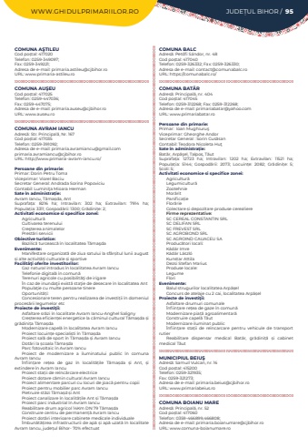 WWW.GHIDULPRIMARIILOR.RO JUDE%u021aUL BIHOR / 95COMUNA A%u015eTILEUCod po%u0219tal: 417020Telefon: 0259-349097; Fax: 0259-349221; Adresa de e-mail: primaria.astileu@cjbihor.roURL: www.primaria-astileu.roCOMUNA AU%u015eEUCod po%u0219tal: 417025Telefon: 0259-447036; Fax: 0259-447075; Adresa de e-mail: primaria.auseu@cjbihor.roURL: www.auseu.roCOMUNA AVRAM IANCUAdres%u0103: Str. Principal%u0103, Nr. 167Cod po%u0219tal: 417035Telefon: 0259-391092; Adresa de e-mail: primaria.avramiancu@gmail.comprimaria.avramiancu@cjbihor.roURL: http://www.primaria-avram-iancu.ro/Persoane din primarie:Primar:%u00a0Dorin%u00a0Petru%u00a0TomaViceprimar: Viorel BaciuSecretar General:%u00a0Andrada Sorina%u00a0Popoviciu%u00a0Contabil: Lumini%u0163a Mioara HermanSate %u00een administra%u021bie:Avram Iancu, T%u0103ma%u0219da, AntSuprafa%u021ba:%u00a0 8216 ha; Intravilan:%u00a0 302 ha; Extravilan:%u00a0 7914 ha; Popula%u021bia:%u00a03311; Gospod%u0103rii:%u00a01300; Gr%u0103dini%u021be:%u00a02; Activitati economice si specifice zonei:Agricultur%u0103 Cultivarea terenuluiCre%u015fterea animalelorPrest%u0103ri serviciiObiective turistice:Bazilic%u0103 turceasc%u0103 %u00een localitatea T%u0103ma%u015fdaEvenimente:Manifestare organizat%u0103 de ziua satului la sf%u00e2r%u0219itul lunii august %u0219i alte activit%u0103%u021bi culturale %u0219i sportiveFacilit%u00e3%u0163i oferite investitorilor:Gaz natural introdus %u00een localitatea Avram IancuTelefonie digital%u0103 %u00een comun%u0103Terenuri agricole cu posibilit%u0103%u0163i de irigare%u00cen caz de inunda%u0163ii exist%u0103 sta%u0163ie de desecare %u00een localitatea AntPopula%u0163ie cu multe persoane tinereOportunit%u0103%u021bi:Concesionare teren pentru realizarea de investi%u021bii %u00een domeniul proces%u0103rii legumelor etcProiecte de investi%u0163ii:Asfaltare sr%u0103zi %u00een localitate Avram Iancu-Anghel SalignyCre%u0219terea eficien%u021bei energetice la c%u0103minul cultural T%u0103ma%u0219da %u0219i gr%u0103dini%u021ba T%u0103ma%u0219daModernizare capel%u0103 %u00een localitatea Avram IancuProiect locuin%u021be speciali%u0219ti %u00een T%u0103ma%u0219daProiect sal%u0103 de sport %u00een T%u0103ma%u0219da %u0219i Avram IancuDot%u0103ri la %u0219coala T%u0103ma%u0219daParc fotovoltaic %u00een Avram IancuProiect de modernizare a iluminatului public %u00een comuna Avram Iancu%u00cenfiin%u021bare re%u021bea de gaz %u00een localit%u0103%u021bile T%u0103ma%u0219da %u0219i Ant, %u0219i extindere %u00een Avram IancuProiect sta%u021bii de re%u00eenc%u0103rcare electriceProiect dotare c%u0103min cultural Avram IancuProiect alimentare parcuri cu locuri de joac%u0103 pentru copiiProiect pentru mobilier parc Avram IancuPietruire st%u0103zi T%u0103ma%u0219d %u0219i AntProiect canalizare %u00een localit%u0103%u021bile Ant %u0219i T%u0103ma%u0219daProiect parc industrial %u00een Avram IancuReabilitare drum agricol 14Km DN 79 T%u0103ma%u0219daConstruire centru de permanen%u021b%u0103 Avram IancuProiect dot%u0103ri interioare cabinete medicale individuale %u00cembun%u0103t%u0103%u021birea infrastructurii de ap%u0103 %u0219i ap%u0103 uzat%u0103 %u00een localitate Avram Iancu, jude%u021bul Bihor- 70% efectuatCOMUNA BALCAdres%u0103: Pet%u0151fi S%u00e1ndor, nr. 48Cod po%u0219tal: 417040Telefon: 0259-326332; Fax: 0259-326330; Adresa de e-mail: contact@comunabalc.roURL: https://comunabalc.ro/COMUNA BAT%u0102RAdres%u0103: Principal%u0103, nr. 404Cod po%u0219tal: 417045Telefon: 0259-312268; Fax: 0259-312268; Adresa de e-mail: primariabatar@yahoo.comURL: www.primariabatar.roPersoane din primarie:Primar:%u00a0 Ioan%u00a0Mughiuru%u015fViceprimar: Gheorghe%u00a0AndorSecretar General : Sorin%u00a0Cus%u0103san%u00a0Contabil: Teodora Nicoleta%u00a0Hu%u0163%u00a0Sate %u00een administra%u021bie:Bat%u0103r, Arp%u0103%u015fel, Talpo%u0219, T%u0103utSuprafa%u021ba:%u00a0 12723 ha; Intravilan:%u00a0 1202 ha; Extravilan:%u00a0 11521 ha; Popula%u021bia:%u00a0 5144; Gospod%u0103rii:%u00a0 2073; Locuin%u021be:%u00a0 2082; Gr%u0103dini%u021be:%u00a0 5; %u0218coli:%u00a05; Activitati economice si specifice zonei:Agricultur%u0103Legumicultur%u0103ZootehnieMor%u0103ritPanifica%u021bieFlor%u0103rieColectare %u0219i depozitare produse cerealiere Firme reprezentative:SC CEREAL CONSTANTIN SRLSC DELIFAN SRLSC FREVEST SRLSC AGROBOND SRLSC AGROIND CAUACEU SAProduc%u0103tori locali:K%u00e1d%u00e1r ImreK%u00e1d%u00e1r L%u00e1szl%u00f3Kunstar AttilaDezsi%u00a0Stefan MariusProduse locale:LegumeFloriEvenimente:Balul strugurilor localitatea Arp%u0103%u0219elConcurs de atelaje cu 2 cai, localitatea Arp%u0103%u0219elProiecte de investi%u0163ii:Asfaltare drumuri comunale%u00cenfiin%u021bare re%u021bea de gaze %u00een comun%u0103Modernizare pia%u021b%u0103 agroalimentar%u0103Construire capel%u0103 T%u0103utModernizare iluminat public%u00cenfiin%u021bare sta%u021bii de re%u00eencarcare pentru vehicule de transport rutier Reabilitare dispensar medical Bat%u0103r, gr%u0103dini%u021b%u0103 %u0219i cabinet medical T%u0103utMUNICIPIUL BEIU%u015eAdres%u0103: Samuil Vulcan, nr. 16Cod po%u0219tal: 415200Telefon: 0259-321935; Fax: 0259-321273; Adresa de e-mail: primaria.beius@cjbihor.roURL: www.primariabeius.roCOMUNA BOIANU MAREAdres%u0103: Principal%u0103, nr. 52Cod po%u0219tal: 417060Telefon: 0359-466899,466808; Adresa de e-mail: primaria.boianumare@cjbihor.roURL: www.comuna-boianumare.ro